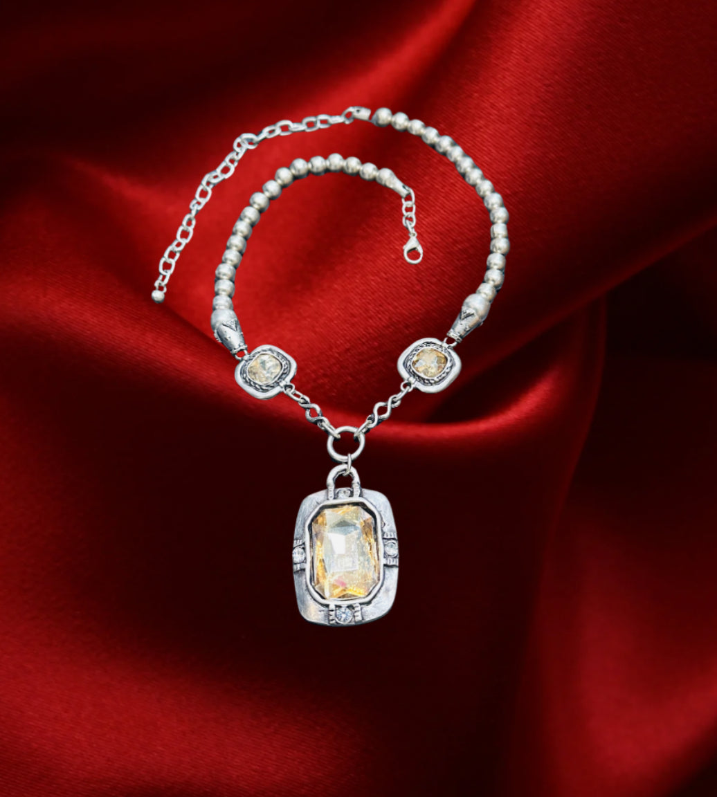 Embrace elegance and confidence with our stunning statement necklace. Handcrafted with an unusual and modern, yet timeless design, this ethnic piece will add a touch of beauty to any outfit. Dress it up or down for any season and feel confident wearing it.