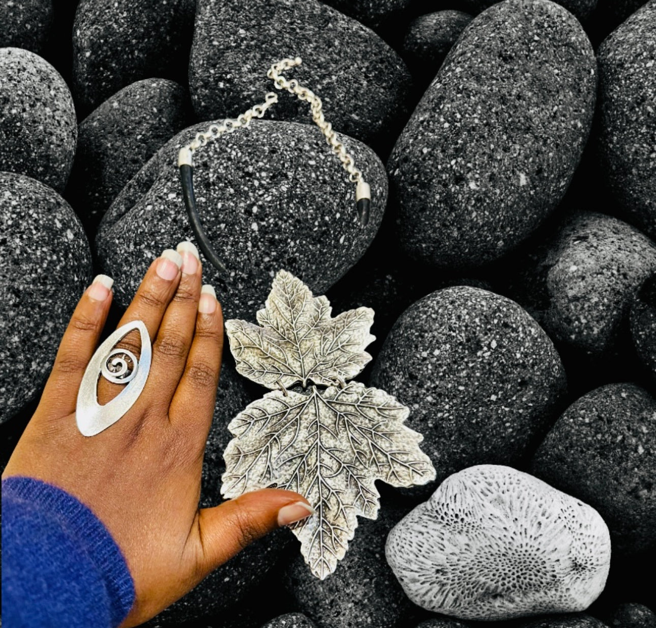 Enhance your style with our Large Ivy Leaf Necklace. This bold statement piece is perfect for those confident in wearing big accessories. Made with leather and silver plating, it adds a touch of elegance to any outfit. Perfect for those looking to make a statement.